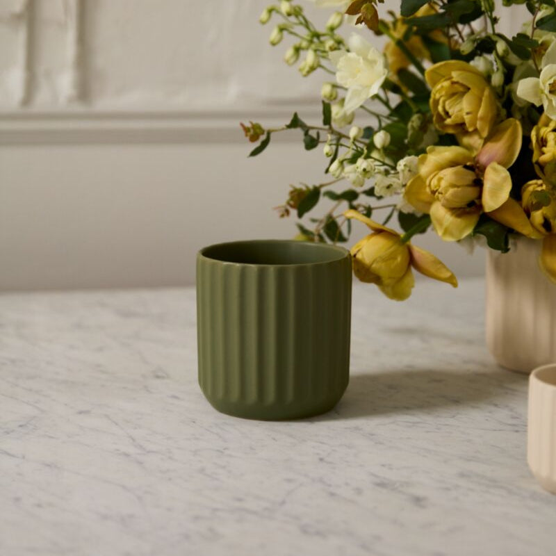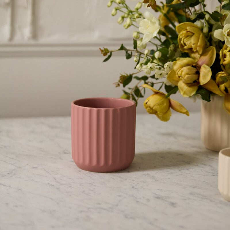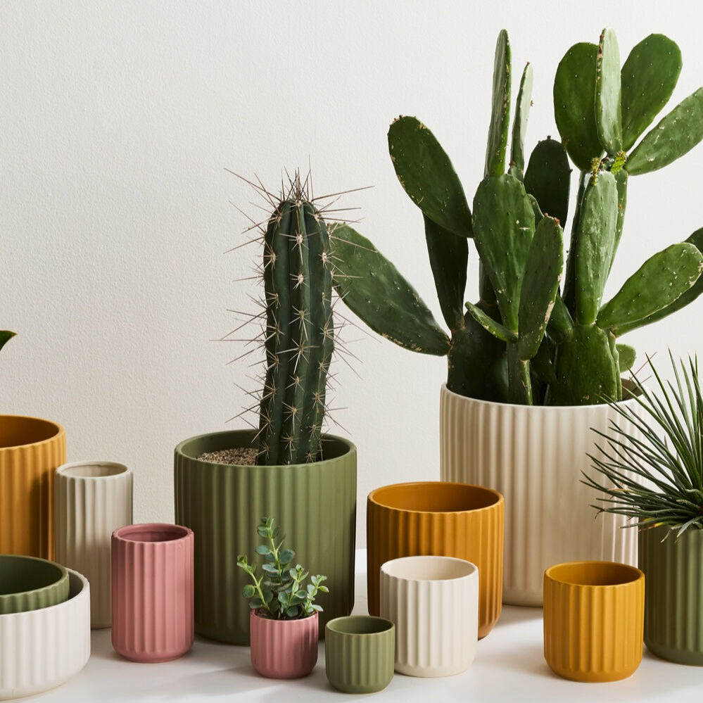 The ribbed Beam Pot in the ideal shade of either muted yellow or cream elevates the standard houseplant with a jolt of color that is sure to brighten every room.