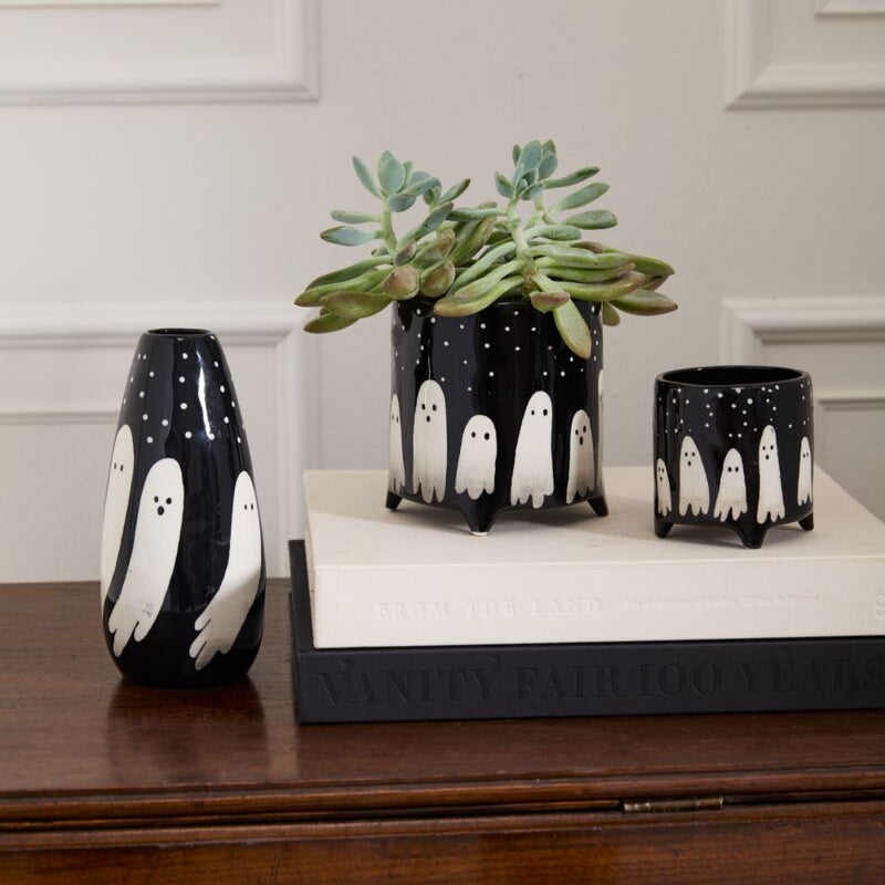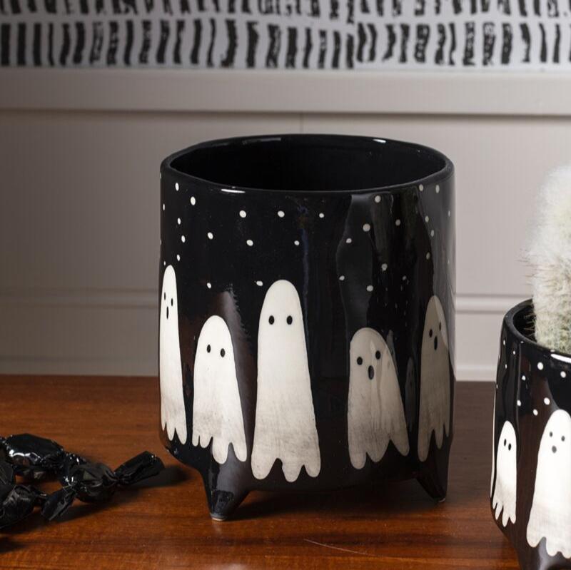 Hand painted spooky ghosts wrap around the Boo Pot, a footed container perfect for dressing up your plants. With a shiny black glaze on stoneware, the Boo Pot can hold a 4.5" or a 3" drop in plant.