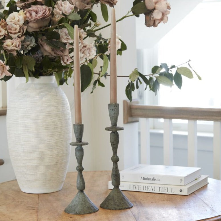 Made from distinctive, weighty metal, the stunning small metal Bristol Candlestick brings a timeless, old-world sensibility to home decor. A greenish patina finish & lightly hammered surface texture add to the aged look. With stacked shapes & a versatile hue, this piece easily coordinates with any interior design style. Add a standard taper candle & pair with the large Bristol size or with the Barton Candlesticks.