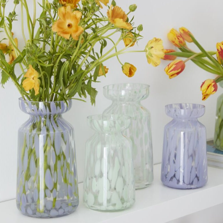 Cue the confetti & celebration with the small Cambria Vase, featuring a trendy pattern & colors of white & minty green on handmade confetti glass. A flared opening & color variation makes this piece truly unique as a florist staple, plant shop merchandise, everyday decor, or a wedding & event vessel. Fill with a collection of fresh-cut stems as a flower vase, or use for bulb forcing.