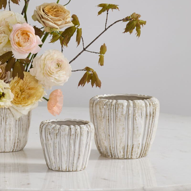 Marbled texture & vertical, dimensional lines give the ceramic Cedric Pot an artful, nature-inspired quality. Featuring a rolled lip & a cream-colored reactive glaze for surface variation, this glossy vessel is gorgeous with any floral or plant color palette. Easy to use with any floral mechanics, this watertight pot is as lovely with fresh blooms as a drop-in plant.