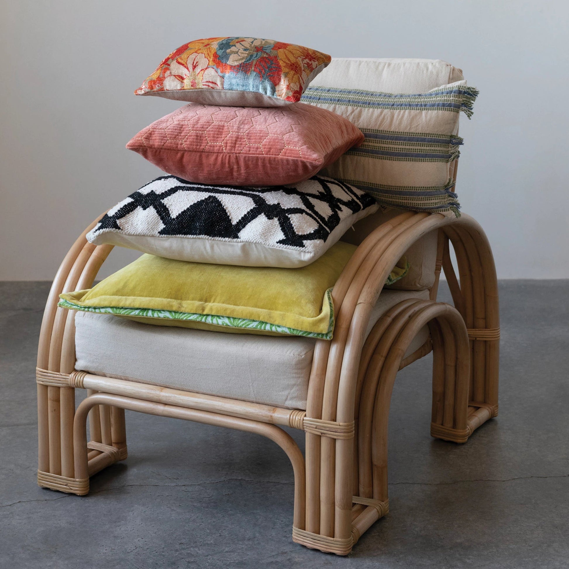 This sophisticated, subtly tropical throw pillow features luxurious cotton velvet construction with a peek-a-boo palm print gusset. Square chartreuse cotton velvet throw pillow with green palm print gusset. Express your constantly evolving style with the simple addition of this eye-catching pillow.
