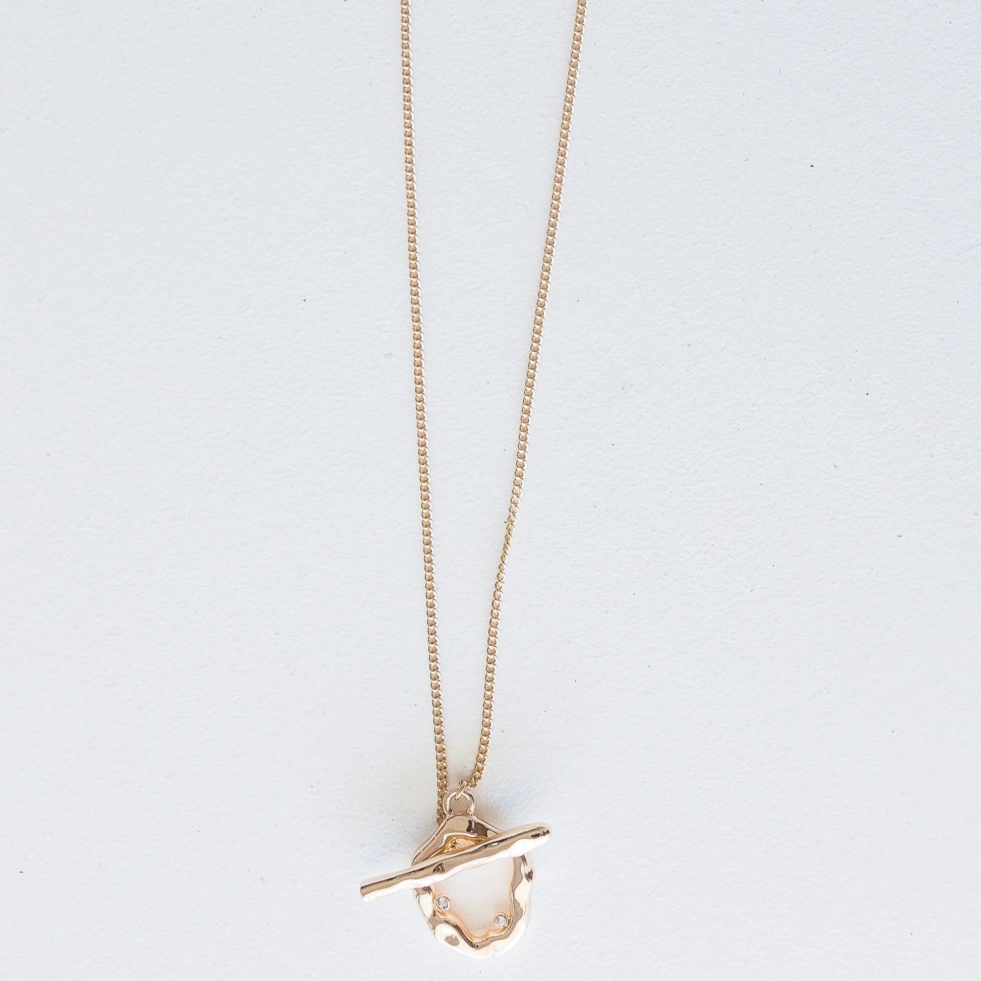 Gold chain necklace with abstract circle front closure, stone detail, 20"