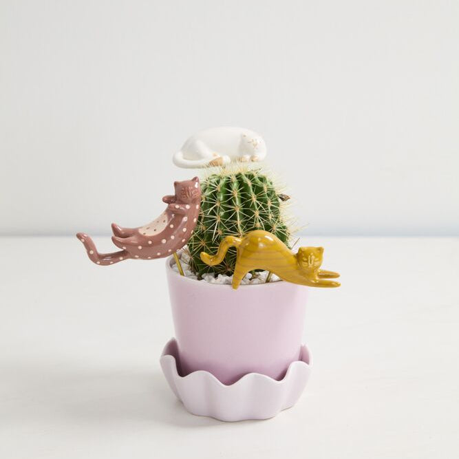 You can always count on cats to do whatever they feel like & these Curious Cats are no exception. These ceramic cat plant sticks are each in the familiar feline positions of big stretch, scratch my tummy, and just let me sleep. Featuring hand painted details on a white cat, striped yellow cat, & spotted brown cat, each with a 4.5" long metal stick, these delightful critters are happy to lounge lazily in your plants.