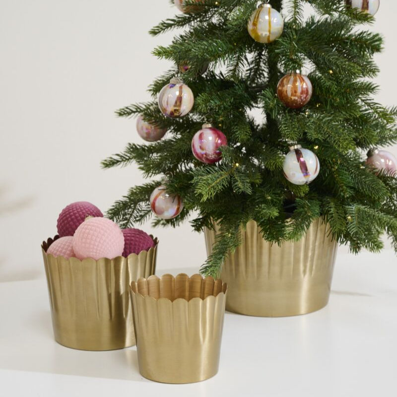 Dress up drop in poinsettias and seasonal trees with the Delicata Pot, a warm gold brushed metal pot with a scalloped detail around the opening. Small pleats stretch halfway down the pot for a bit of texture, while the bottom half has a smooth, clean finish. Gift plants in any size of these versatile, timeless pots just as they are, or add a velvet ribbon and bow to make it even more special.