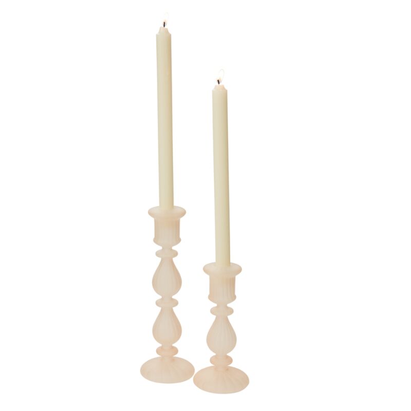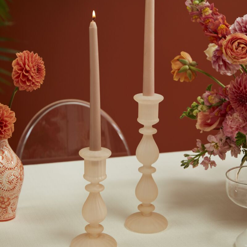 Create a trendsetting centerpiece with the small pale pink Encanto Candlestick. Made from very lightweight, delicate, handmade borosilicate glass with a matte pink frosted finish, this neutral-toned candlestick is delicate & chic for home decor or wedding & event design. A traditional shape complements trendy, rounded edges.