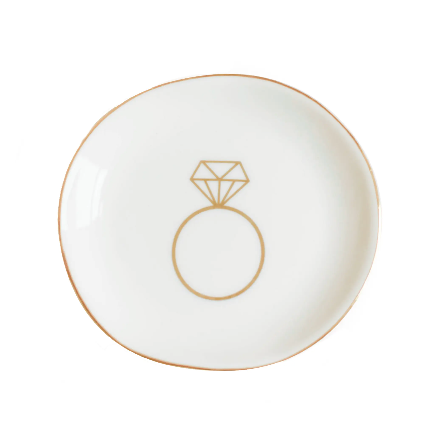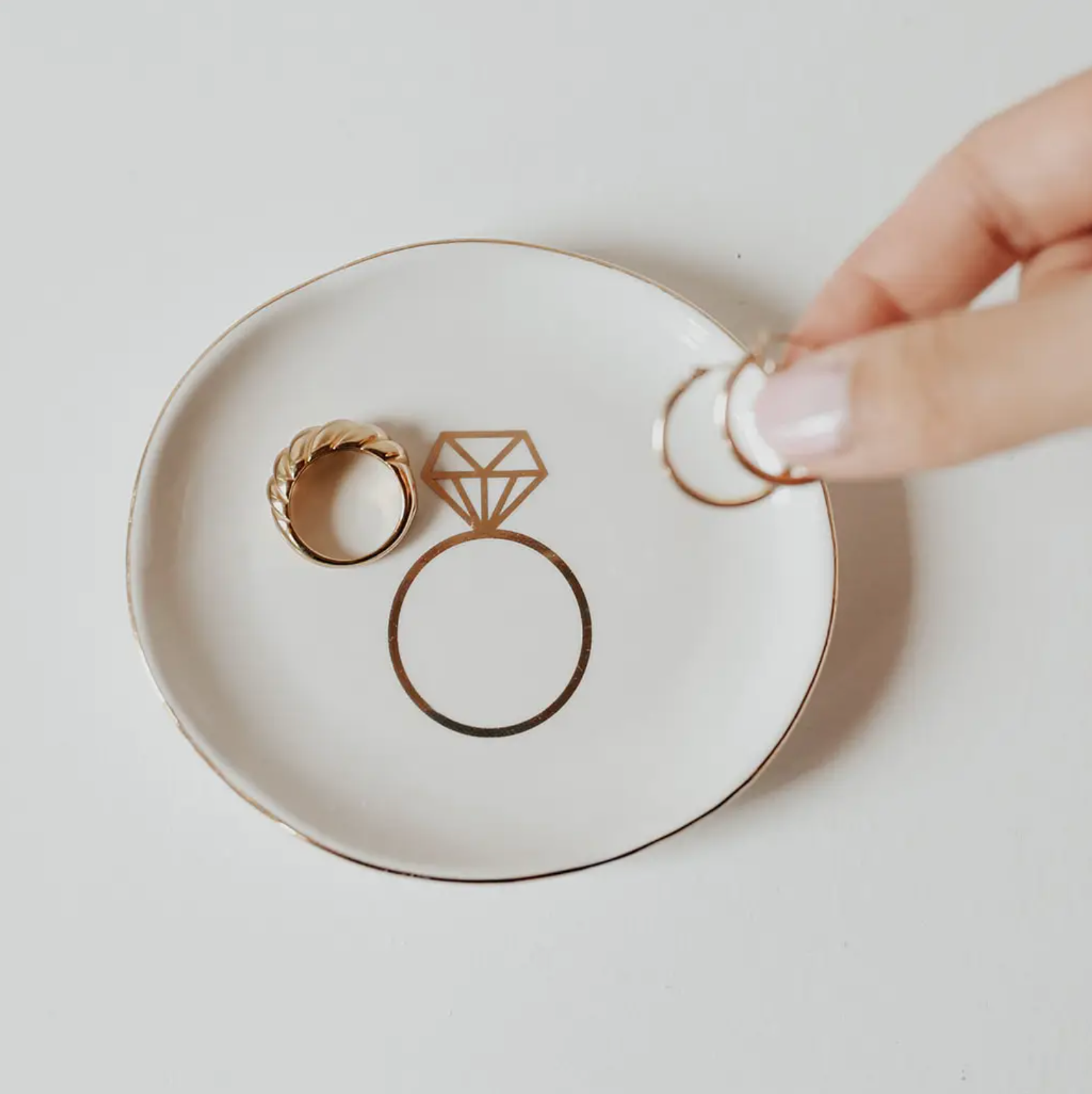 Every bride & bride to be will swoon over their new Engagement Ring Jewelry Dish! Our beautiful gold foil trinket tray is perfect for placing your wedding and engagement ring or earrings to keep them in a safe place. The gold foil details add a touch of chic glam, perfect for your office or bedroom! This beautiful tray also makes a great gift for the bride to be!