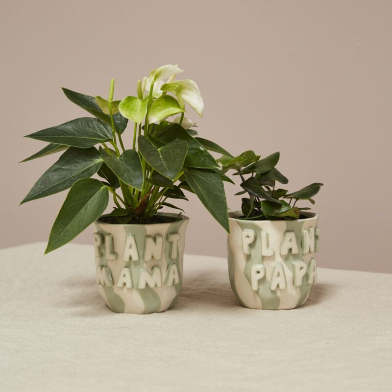 For green thumbs & new plant parents alike, the Favorite Parent Pot celebrates plant mamas of all kinds. This ceramic pot is a perfect gift for Mother's Day, birthdays, or just because. Sage green & watertight with neutral stripes & dimensional letters cut out & hand applied, this pot is best paired with a 4-inch drop-in plant baby.