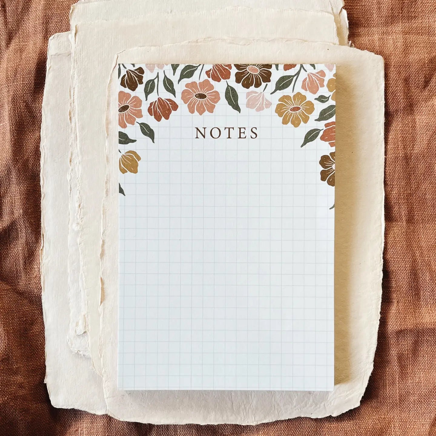 4”x6” tear-away notepad 50 sheets White backdrop with light grid Cardboard backing This sweet little notepad is perfect for jotting notes, making to do lists, and cheering up any home or office space. It features original Flora West florals in warm, earthy colors, and the text ‘NOTES’ below. The rest of the page has a light grid to keep notes organized.