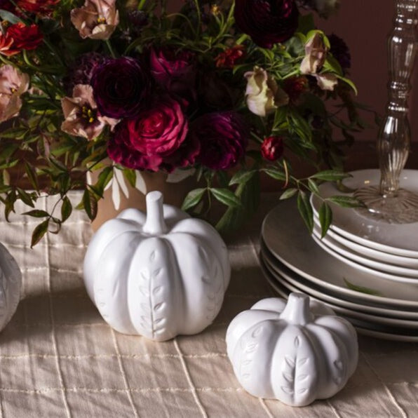 The Garner Pumpkin is a modern take on classic Harvest décor. This carved ceramic pumpkin has an imprinted pattern all the way around and has a super smooth glazed finish. The perfect accent piece for a bountiful Harvest table.
