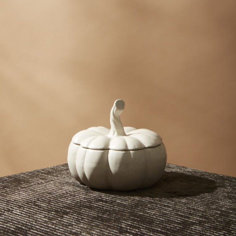 Dipping into less traditional harvest colors, the Hallow's Eve Pumpkin is a beautiful off-white glazed ceramic container with a stemmed lid. This petite pumpkin easily layers into a harvest table or styled moment for the fall season.
