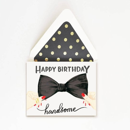 Crisp bow tie with woman's hands straightening up her handsome man's attire.