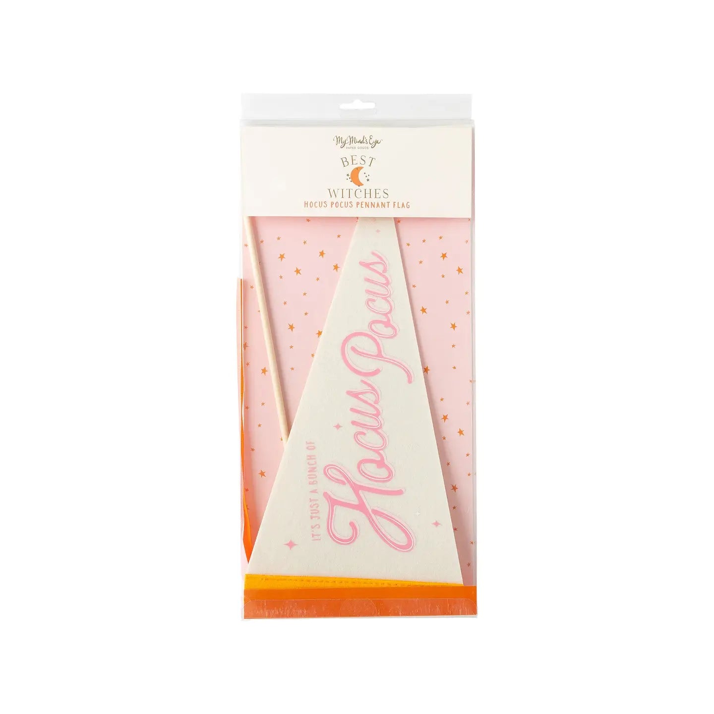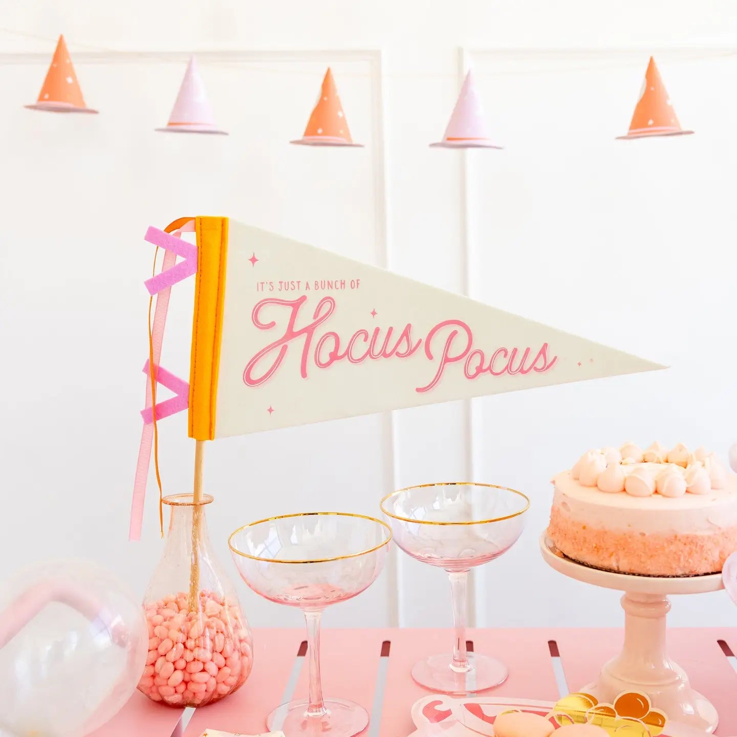 Get your party spook-tacular with our Hocus Pocus Felt Banner! This versatile pennant is perfect for Halloween parties, adding a touch of fun and whimsy to your decor. This banner is a must-have for your next magical gathering! • includes 1 - 14" wood dowel • Felt pennant is 7" wide x 14.5" long