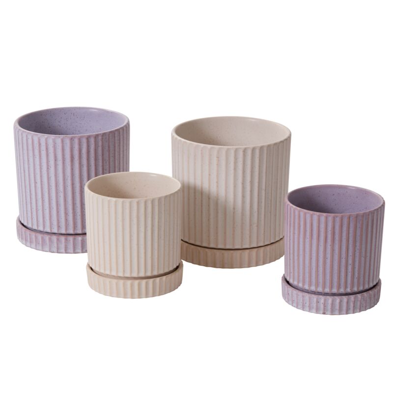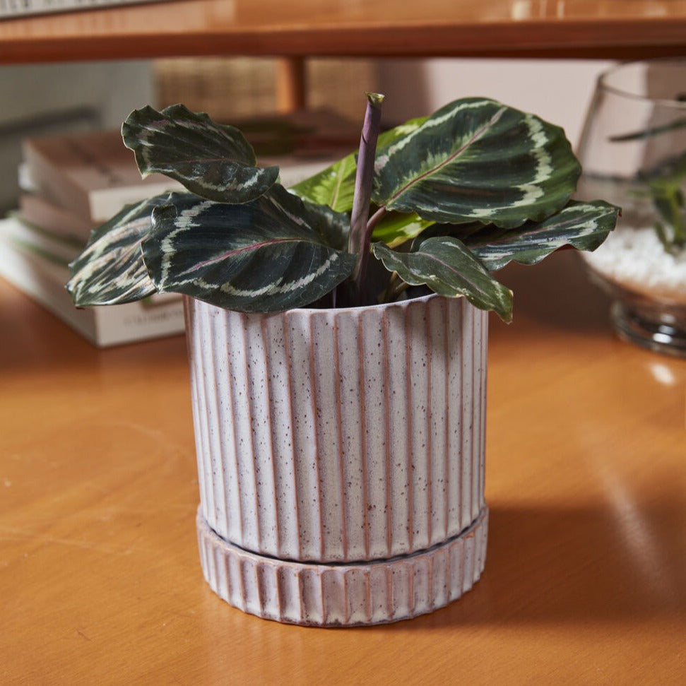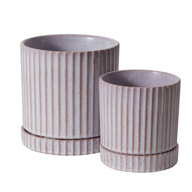 Give your home a fresh touch of trendy color & texture with the ribbed cylinder Los Feliz Pot. This chic, modern indoor planter is finished in a reactive glaze that creates beautiful color variation & an organic design. A drainage hole helps prevent overwatering & a matching saucer protects surfaces from moisture.
