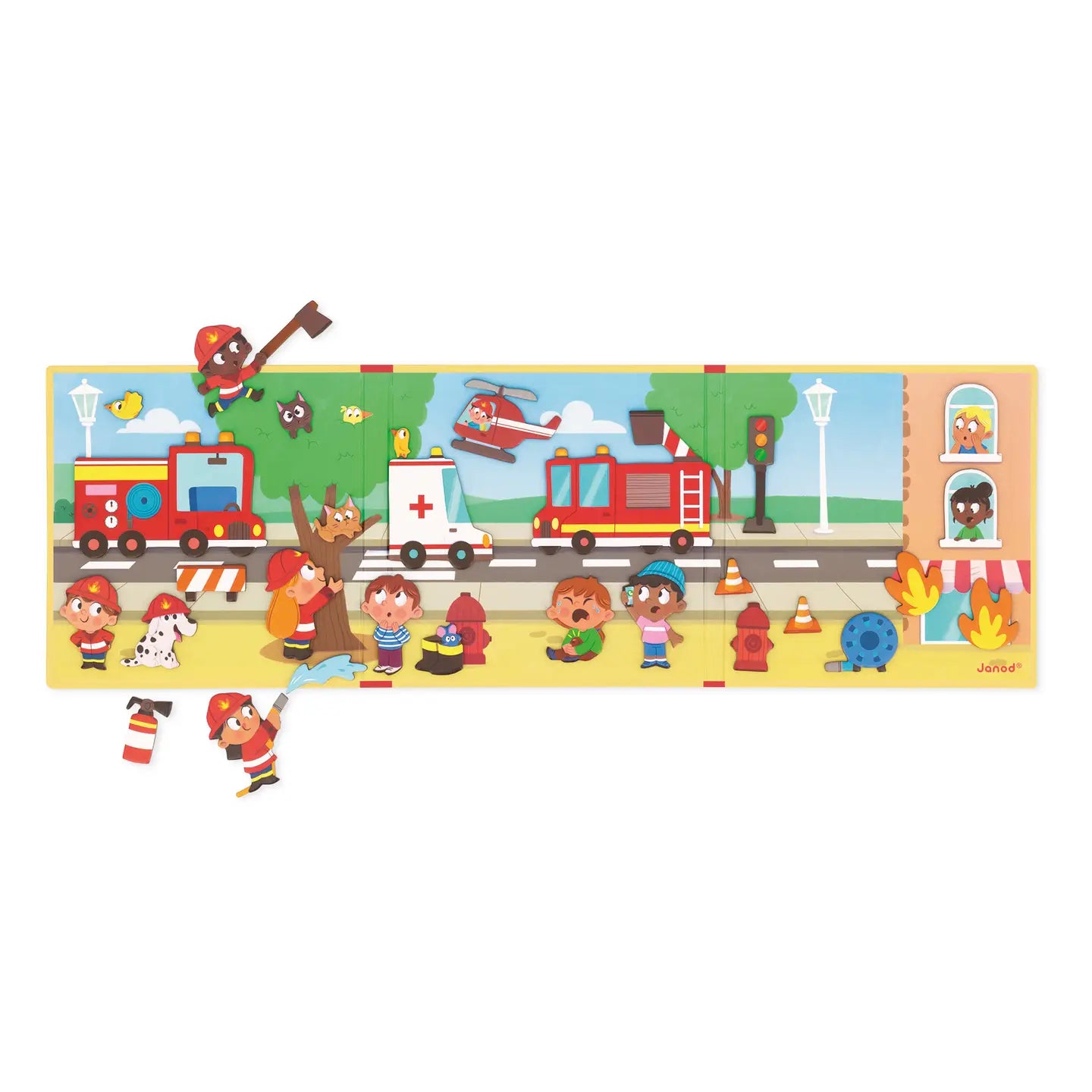 Be a firefighter for the day! A fire has engulfed a shop and a little girl has broken her leg, but thankfully, the fire engine and ambulance aren’t far away! Open up this adorable book to discover a large magnetic backdrop and 30 magnets to help little ones invent lots of firefighter-related stories. Practical: this pocket-sized book can be taken everywhere!