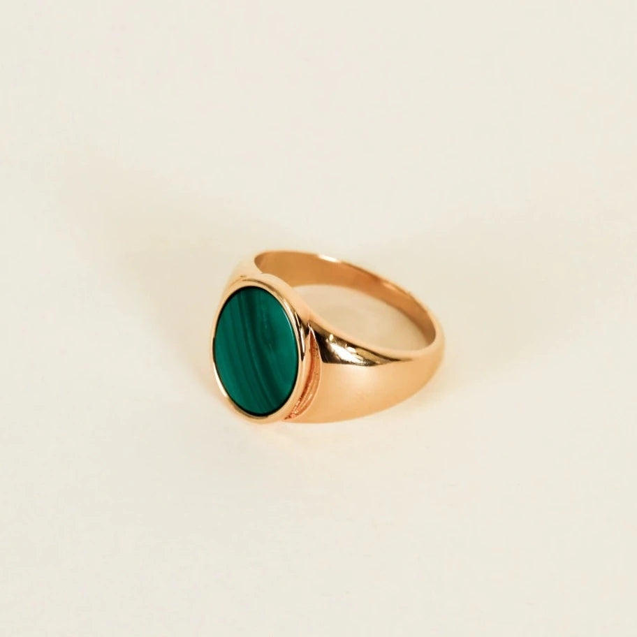 A new take on our ever-popular signet ring, the Malachite ring is made from a substantial oval of Malachite stone with a graduating width band of gold.