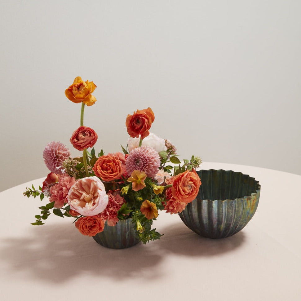 Bring rustic charm, earthy, hues, & a modern shape to table settings with the small lightweight Monarch Bowl. Made from pressed sheet metal with clean pleats & a varied patina finish, this low bowl makes a striking statement for everyday home decor or wedding & event design. Fill with a succulent collection or florals for a stunning centerpiece.