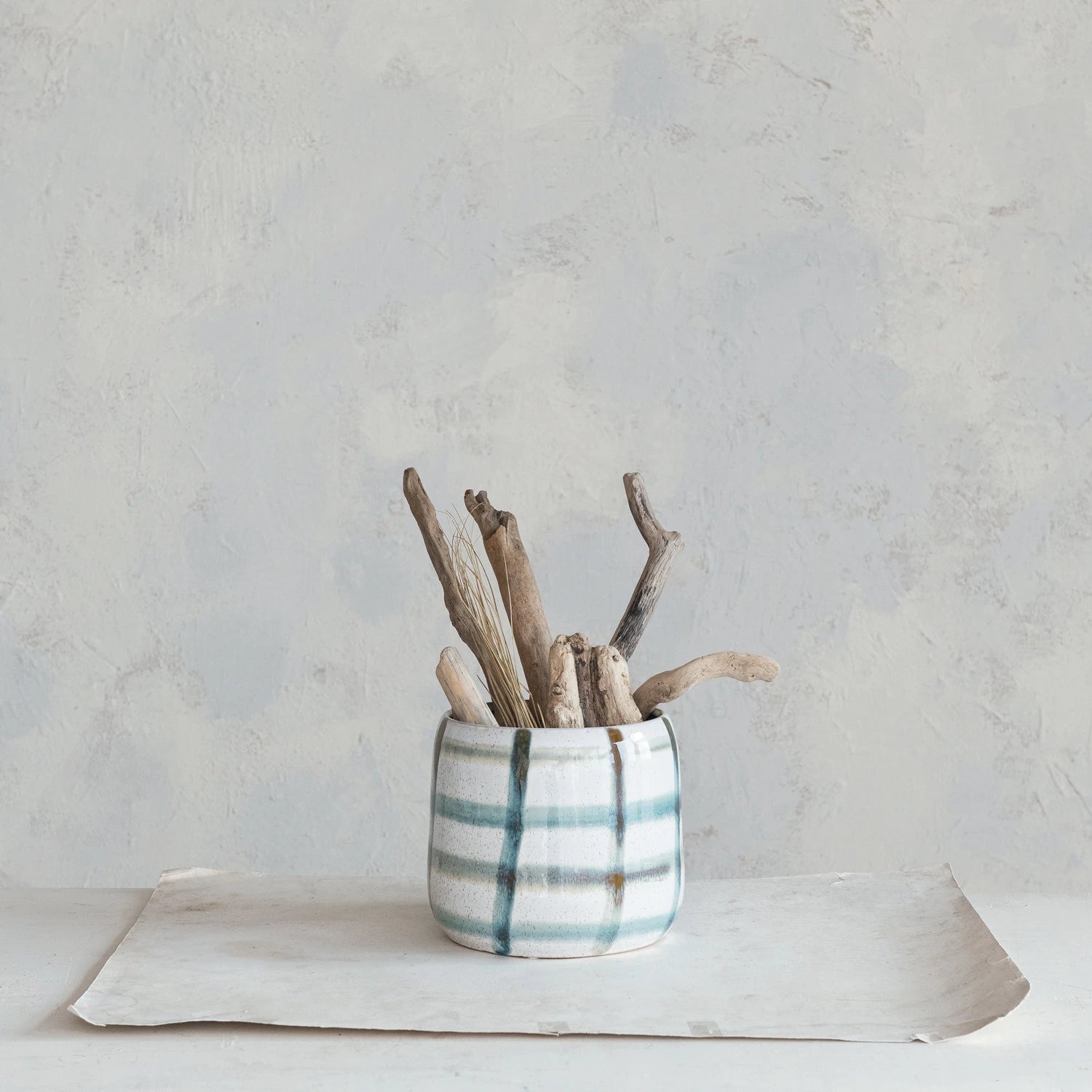 - Hand-Painted Stoneware Planter w/ Grid Pattern, Reactive Glaze, Multi Color (Holds 7" Pot) (Each One Will Vary)