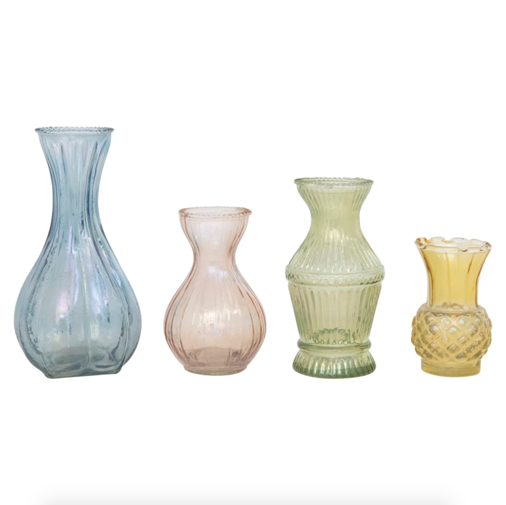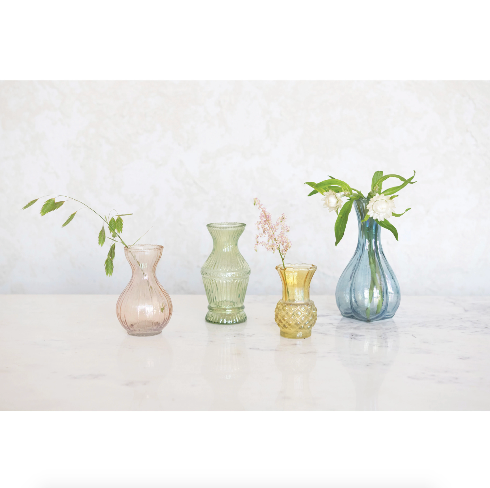 These glass bud vases come in four light colors that will add a pop of fun design and color to your table, counter or shelf! Mix and match colors and shapes and fill with your favorite stems!
