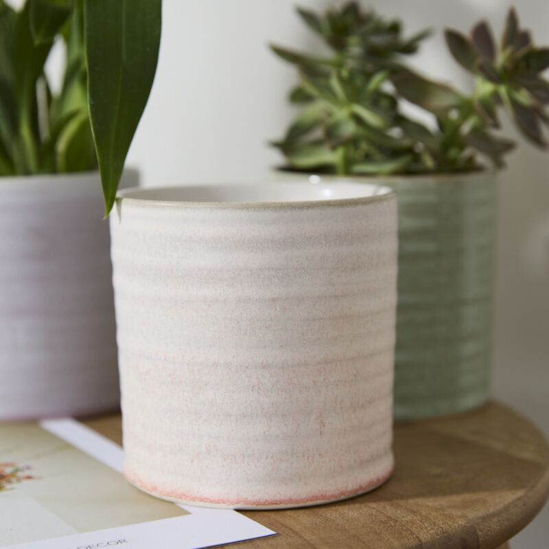 Subtle texture and playful color combine to make the Roux Pot a soft but punchy option for any 4-inch standard drop in plant or bunch of fresh cut florals. This stoneware pot has slight horizontal ribbing that gives the feel of a hand pulled vessel, and the price point of one to stock up on all year round. A reactive pale pink glaze pairs with almost any floral palette and feels fresh when styled alongside the purple and green colorways of the Roux Pot.