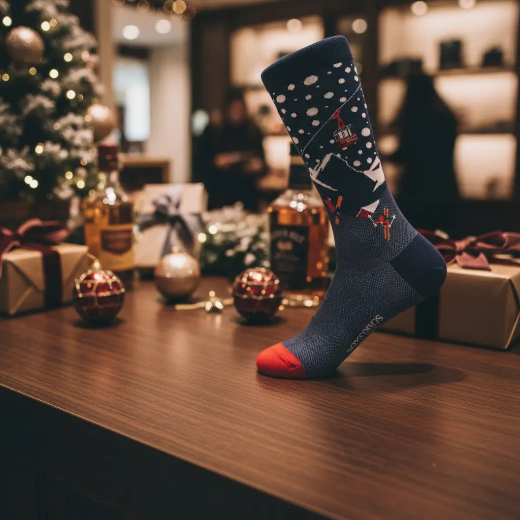 These fine Pima socks feature a highly detailed birds-eye pattern creates a snowy mountain-scape complete with ski lodge, embroidered skier, snowboarder, and ski lift. Finished with wide ribbed cuffs and extra stretch for comfort, these gift-worthy socks stand out on display!