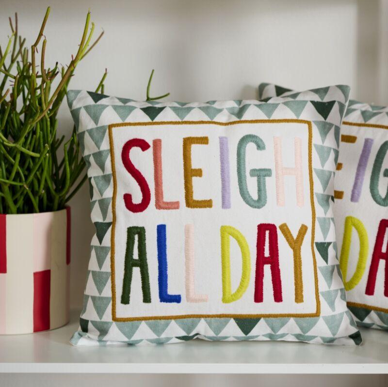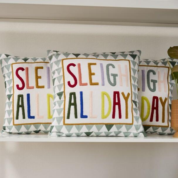 Add a touch of festive flair to any space with the Brights Pillow. The square pillow features embroidered words “SLEIGH ALL DAY” in multicolored letters. Comes with a zipper back opening and include an insert, offering comfort and style with a trendy, punny twist.