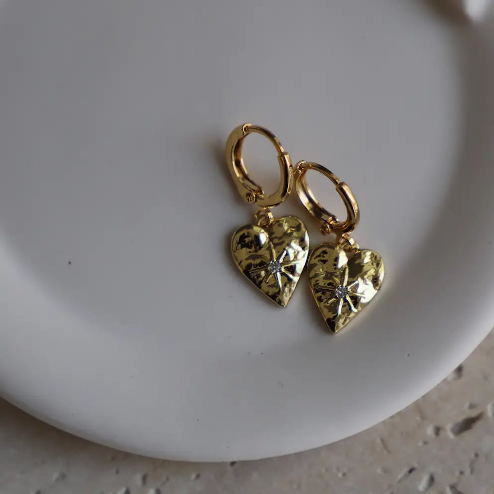 Heart Huggies with cz starburst Materials: gold plated brass and cz Length: 1" with the heart .5"