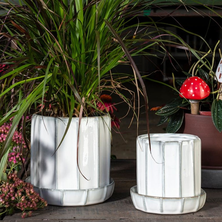 The Tamar Pot in creamy white glaze has a vertical ridged design, along with a drainage hole and saucer, proving the importance of attention to detail when you’re looking for the perfect pot.