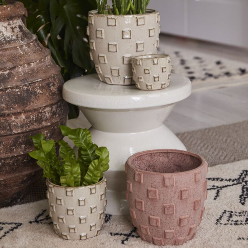 We've put a spin on the checkerboard pattern trend with the dimensional, abstract Ticul Pot, featuring a carved, bas-relief texture & a glossy, tan reactive glaze. Pop in a plant, or use this small watertight decorative piece as a vase for seasonal arrangements. It also coordinates nicely with the Tayrona Napkin Rings to elevate your interior design.