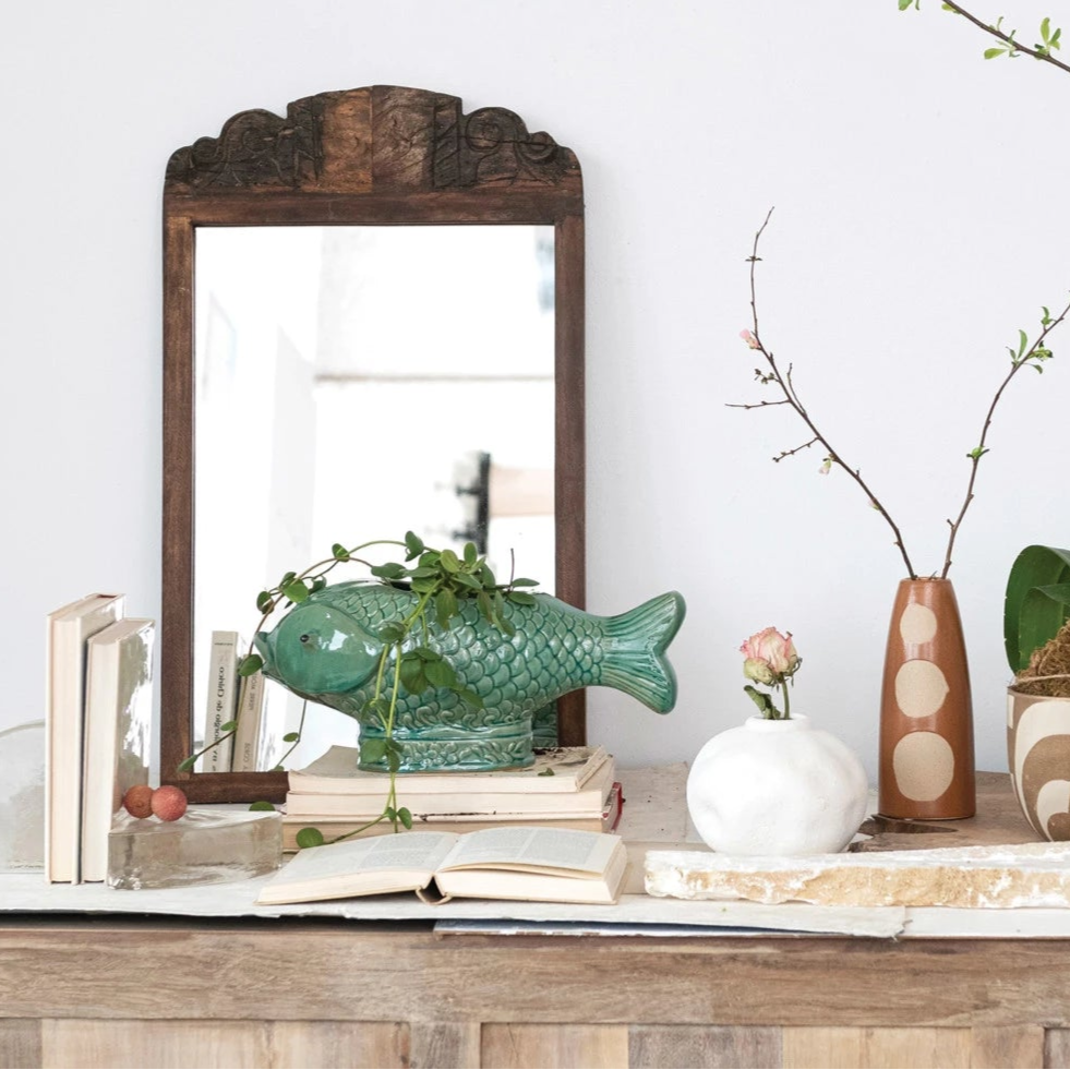 This stoneware fish planter with debossed design and reactive glaze in turquoise is a lovely piece that can brighten up any space. Perfect for adding a touch of playfulness and seaside flair to any beach house, tropical-inspired interior, or aquatic-themed space. Can be used to display plants, flowers, herbs, or succulents. Made of stoneware.